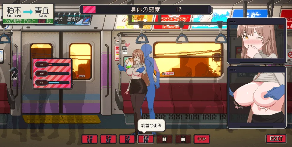 主人公下班回家的火车上,偶然遇到一位漂亮女孩,情不自禁地开始骚扰她。在这个小游戏中,玩家需要选择屏幕底部显示的选项来提升快感槽,让女孩在火车上达到高潮。如果快感槽达到最大值,游戏就会强制关闭,所以在骚扰女孩时务必小心控制动作。
