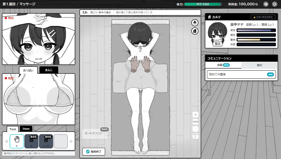 按摩部分采用触控式操作,需要用鼠标点击想要触摸的部位。如果一开始就触碰到胸部或臀部等敏感部位,警戒等级会提升,达到最高等级后游戏结束,所以务必小心。