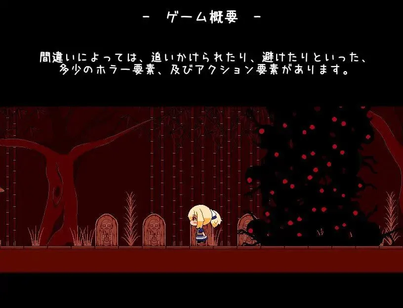 这是一款横向像素地图、只需从左向右前进的点阵式恐怖步行模拟器。如果发现了错误,请前往左侧的门。如果没有错误,请从右侧的门继续前进。※本作品是受《8号出口》启发的作品,即所谓的8号出口类游戏(8番出口ライクゲーム)。