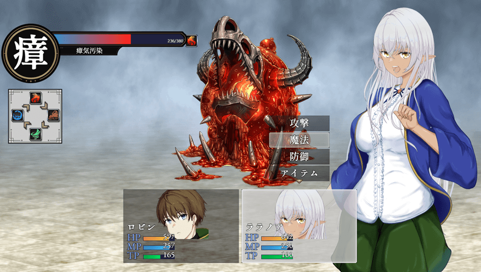 社团“ Hachon ”主要销售同人游戏,这款游戏的主角是身材丰满的黑暗精灵拉拉诺拉。游戏战斗模式很简单,除了Boss之外,其他敌人只需触碰即可击败,感觉无需花费太多时间练级就能快速通关。