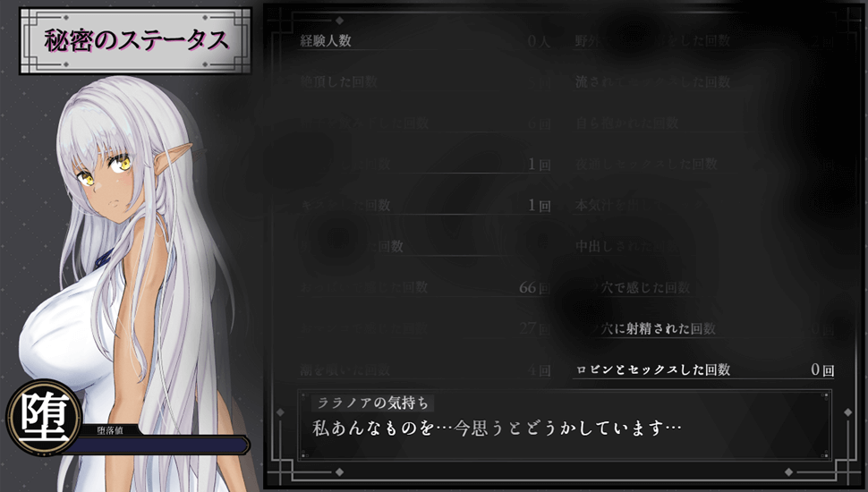 如果游戏初期因瘴气而被迫退出,你会在拉拉诺拉的房间和城镇的某些地方发现性行为的痕迹,拉拉诺拉的行为也会变得异常,仿佛在隐瞒什么,她与其他男性的NTR事件也会逐渐发展。你还可以通过菜单中的“秘密状态”选项窥探拉拉诺拉不断增长的性经历以及她当前的感受。