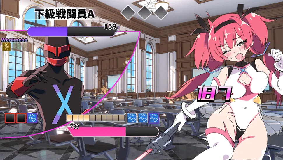 当反派黄袭击巴茨就读的学校时,他使用了一种名为“H攻击”的招式,将她抓住,并以类似便当盒的姿势插入她的体内。如果她输了,就会被推到教室窗户上,站着被黄从后面强奸。在屈辱的结局中,黄在屋顶上强奸了她,而下面的男生们则在一旁围观。