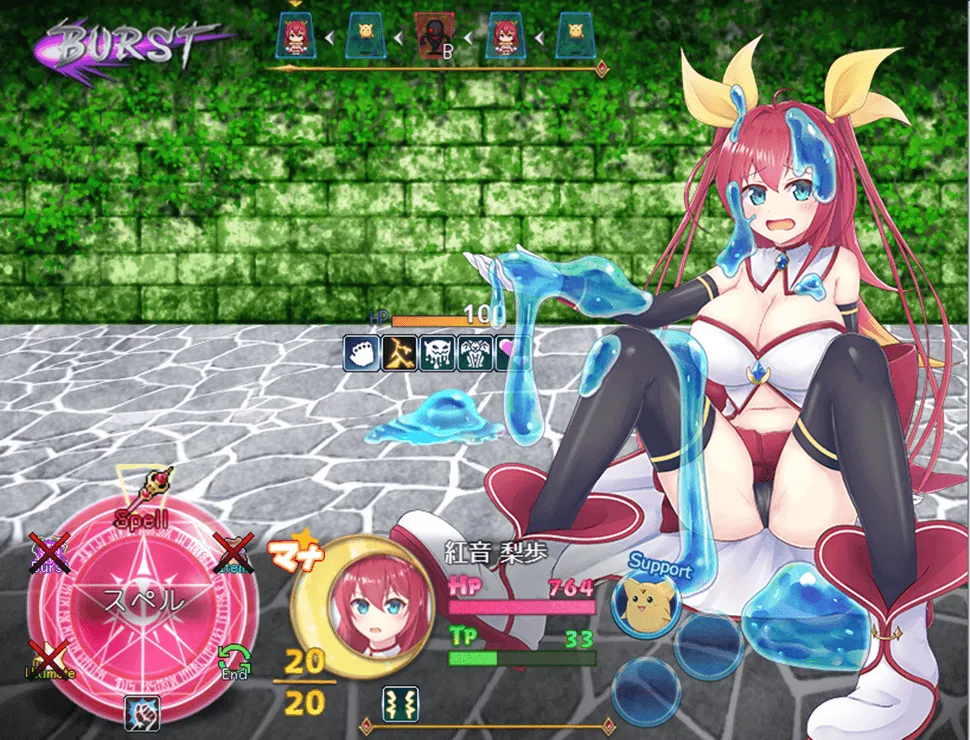 弱点属性区域带有心形标记的敌人会在战斗中使用H攻击。如果莉穗被敌人的束缚攻击击中,她会被束缚。除非她使用技能解除束缚,否则战斗将直接进入H攻击阶段。