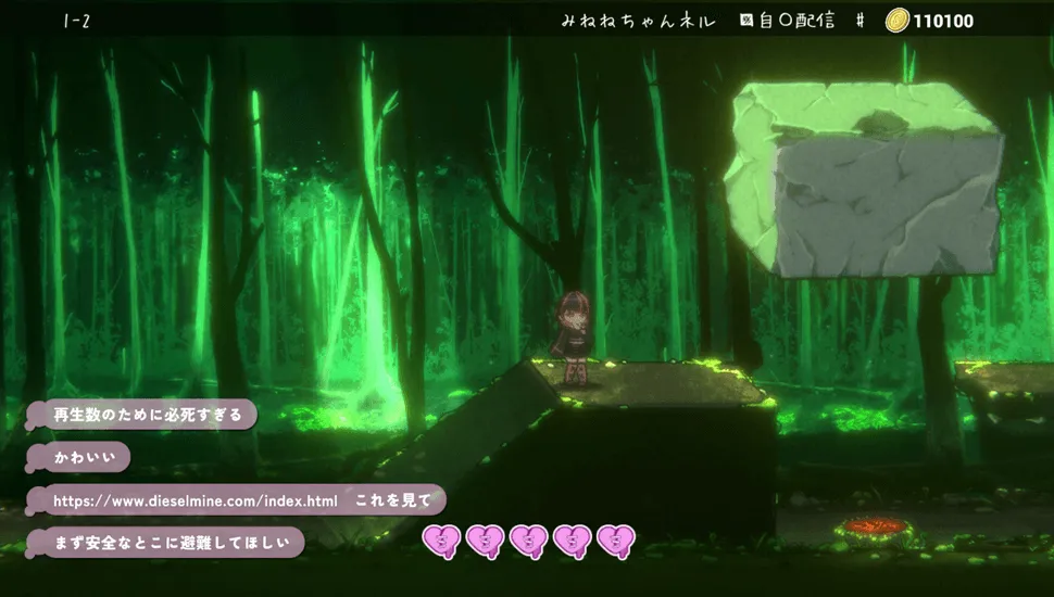 社团“ Dieselmine ”主要销售同人游戏,这款游戏的主角是身材丰满、精神状态略显不稳定且外表惹人厌的女孩米妮妮。游戏中,即使体力耗尽也可以无惩罚地复活,而且谜题元素不多,因此难度似乎不高。